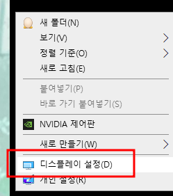 윈도우 바탕화면에서 마우스 오른쪽을 클릭하여 디스플레이 설정으로 들어갑니다.
