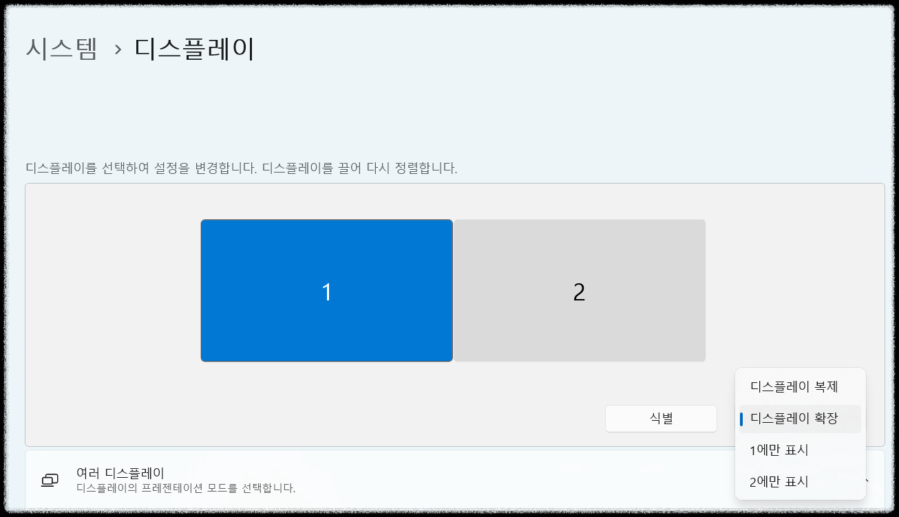 요즘 대부분은 모니터 2대를 연결하면 자동으로 2대의 모니터를 자동으로 인식하는 경우가 많습니다.
